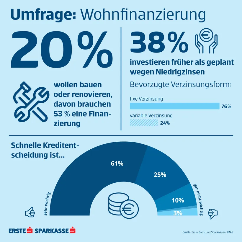 Die Hälfte aller ÖsterreicherInnen wünscht sich eine Veränderungen in der Wohnsituation und sogar jeder Fünfte (20 Prozent) hat in nächster Zukunft Bau- oder Renovierungspläne für seine eigenen vier Wände. Mehr als die Hälfte davon braucht eine Finanzspritze. „Unsere Experten schätzen den Fremdfinanzierungsbedarf für sanierungsbedürftige Privatimmobilien in den nächsten zehn Jahren auf knapp sechs Milliarden Euro. Wer einen Kredit benötigt, sollte bald handeln. Wir gehen davon aus, dass spätestens 2019 wieder Bewegung in den Zinsmarkt kommt. Deshalb raten wir zu Fixzinsen“, so Thomas Schaufler, Privatkundenvorstand der Erste Bank Oesterreich. Acht von zehn ÖsterreicherInnen erwarten bei ihrer Finanzierung eine schnelle Entscheidung von der Bank. Erste Bank und Sparkassen garantieren deshalb ab sofort eine Kreditentscheidung für Wohnfinanzierungen innerhalb von 24 Stunden.