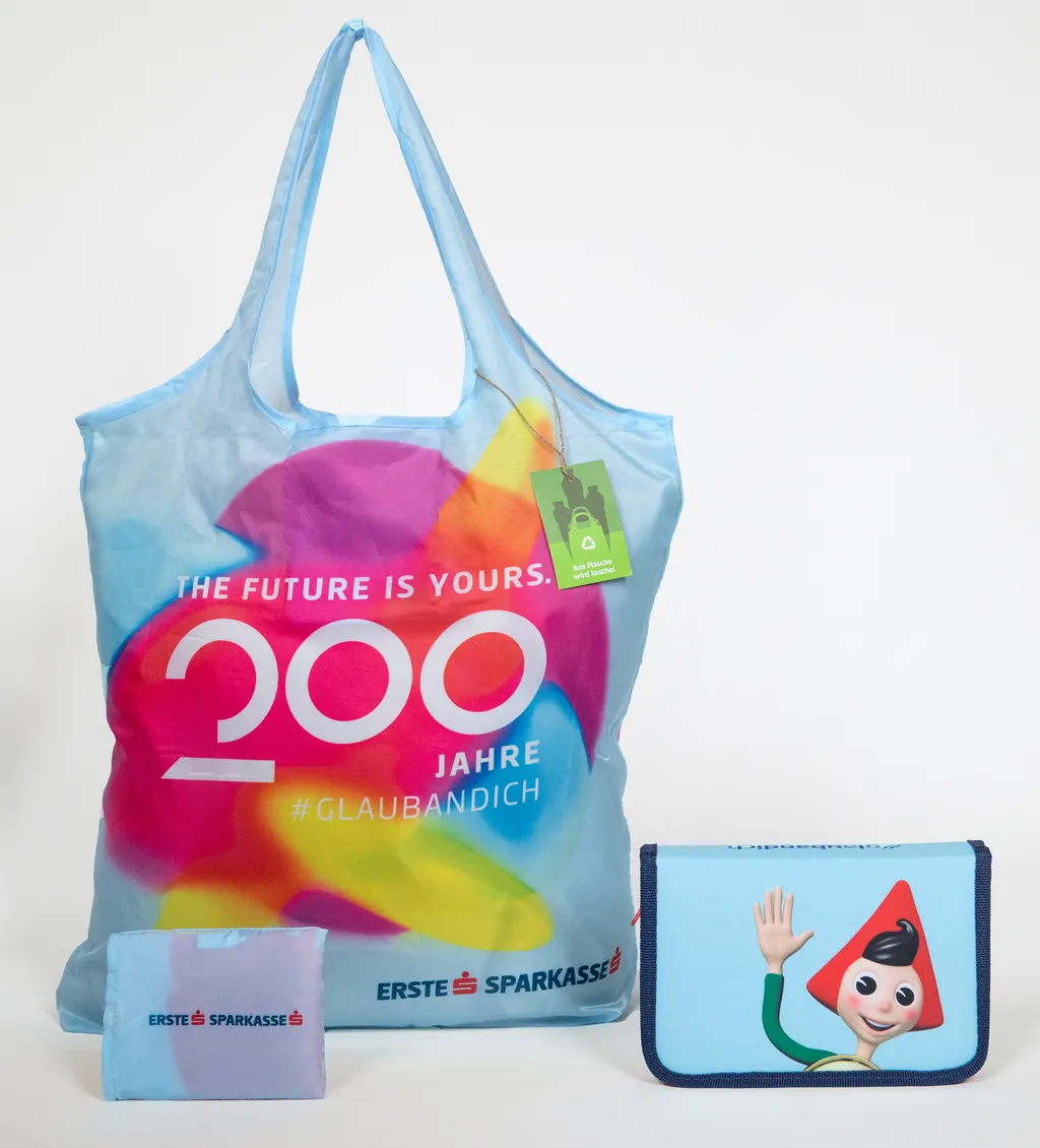 - World Savings Day gifts from the Erste Bank: Reusable shopping bag made from recycled PET bottles and a ‘Sparefroh’ pencil case
